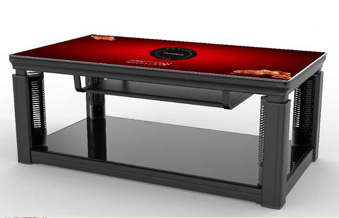 岩板、隐形电磁炉、智能语音,三秒速热,电镀转角,中层架,黑木纹色,立柱显屏,USB插口,收纳线盒,双开关控制